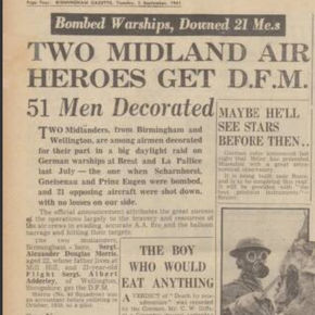 Albert flew a tour of duty with 115 Squadron from RAF Marham, Norfolk in Wellington Bombers. He took part in a bombing raid on Brest harbour in France on the 24th of July 1941 in attempt to damage or destroy three German Battleships including the Scharnhorst. Flight Sergeant Adderley was the rear gunner of a Wellington. Just outside the flak barrage area, his aircraft was attacked by a German Me.109 fighter which opened fire at 600 yards range, hitting the armour of the rear turret. Flight Sergeant Adderley returned fire at 300 yards, giving him a long burst to within 50 yards. The enemy aircraft turned off to port and, after one more burst, crashed into the sea out of control. For his action and courage, Flight Sergeant Adderley was awarded the Distinguished Flying Medal. His station commander commented “Flight Sergeant Adderley has now carried out 43 operational flights and has always shown the greatest keenness to get at the enemy. His enthusiasm and courage has done much to raise the esprit de corps of the Air Gunners of his flight. Strongly recommended for the immediate award of the Distinguished Flying Medal.”